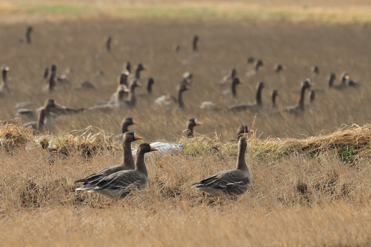 この田んぼでも数百の群れで採餌していました。