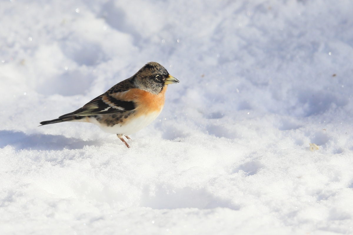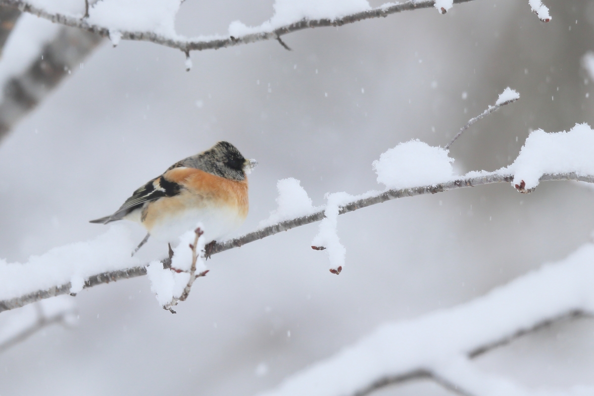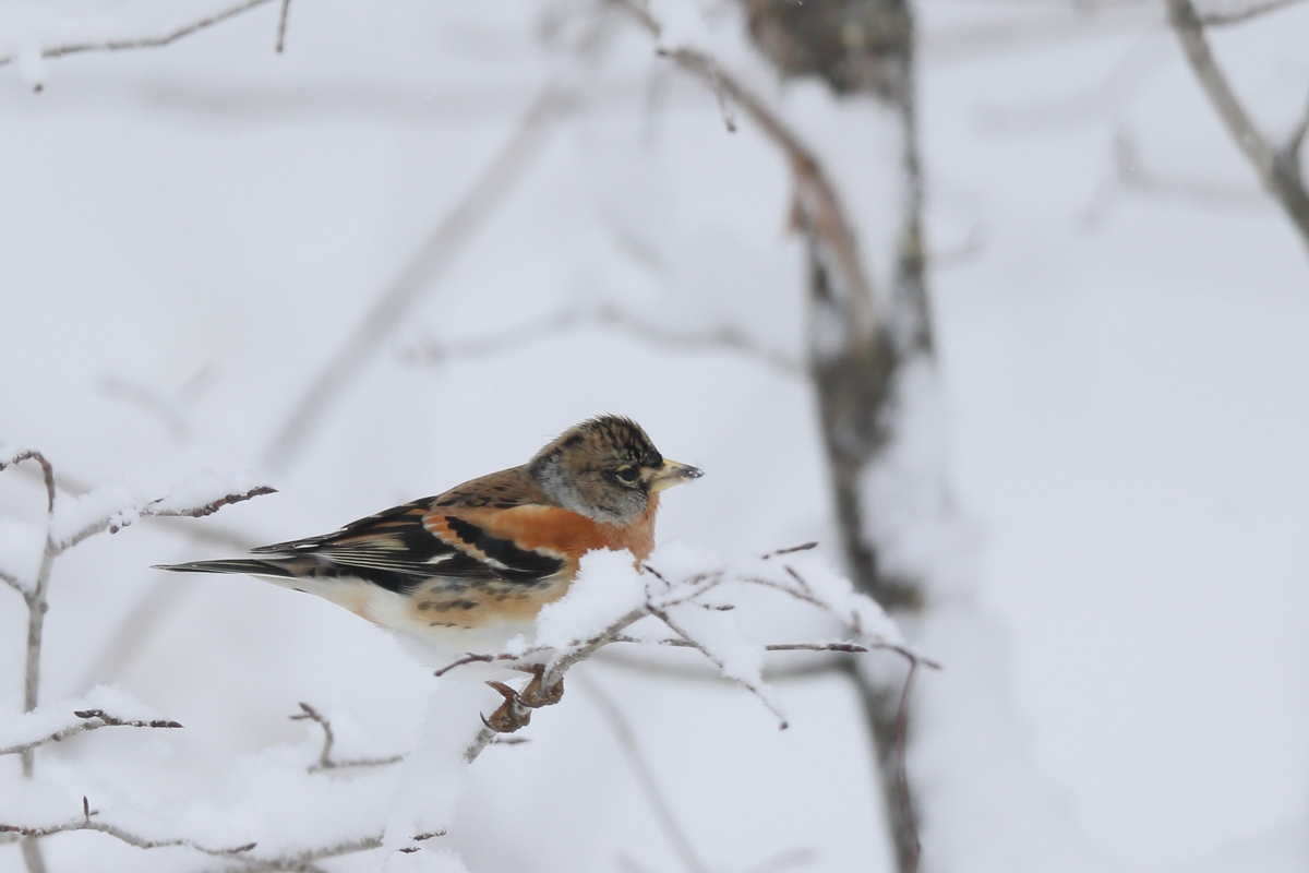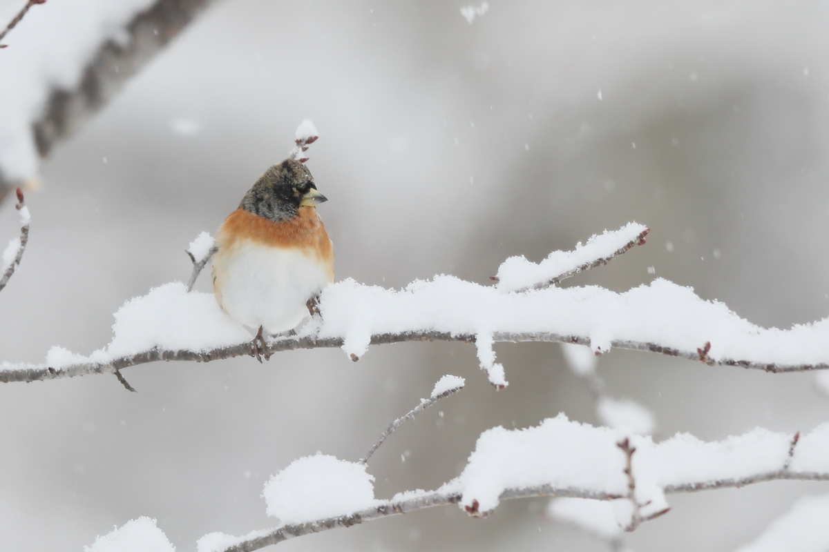 アトリは冬鳥です。3月頃の渡りの時期に雪がとけていると集団でやって来ますが、今は数羽程度です。