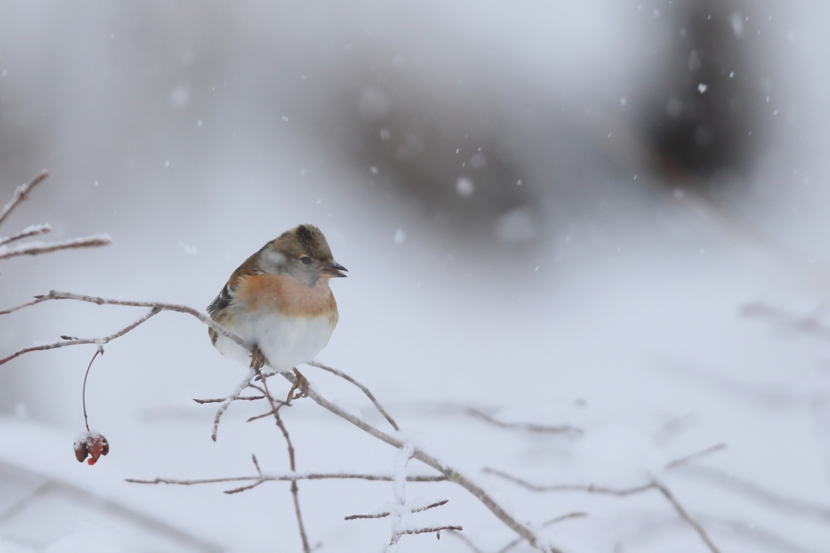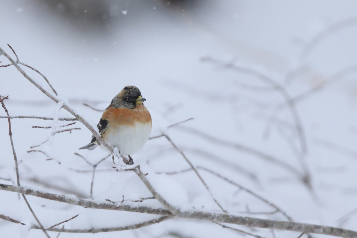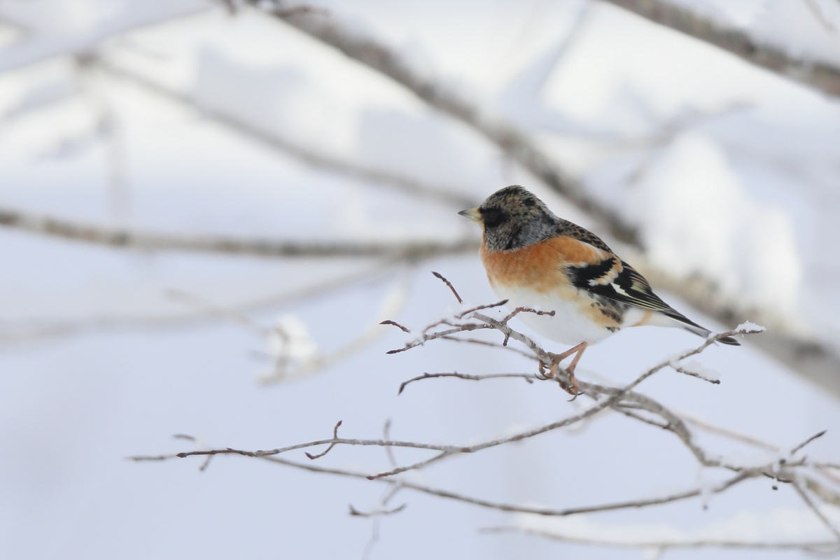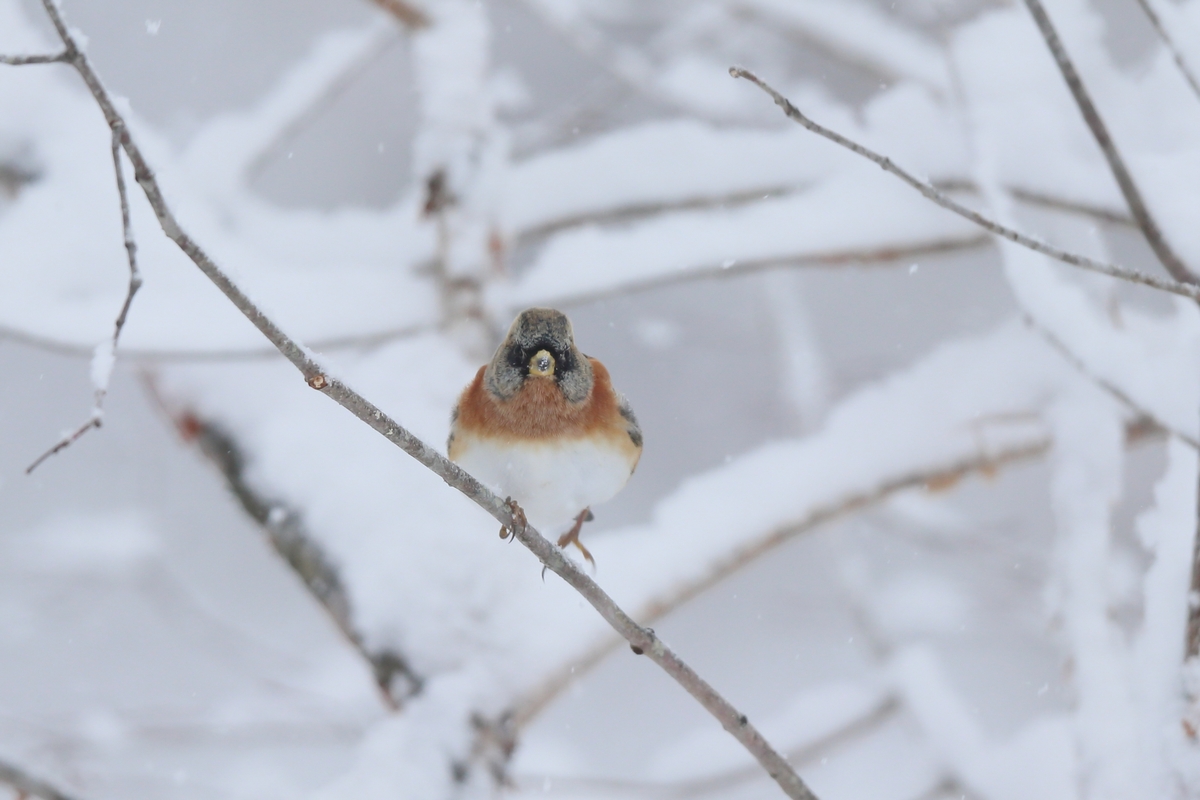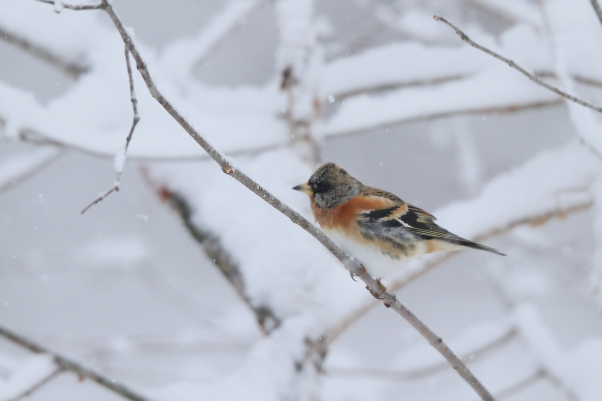 アトリは冬鳥です。3月頃の渡りの時期に雪がとけていると集団でやって来ますが、今は数羽程度です。